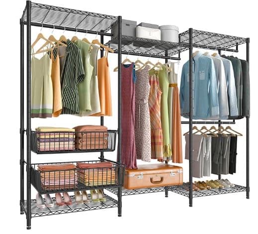 5 Tiers clothes racks for hanging clothes, placing accessories, bedding, lining, shoes, etc. Easily maximize your storage space by providing shoe storage, double hang storage, long hang storage, folded storage. Made of high quality iron, it features stable, sturdy and reliable freestanding closet system. Easy access in bedroom, cloakroom, clothing store, laundry room, walk-in closet and more.